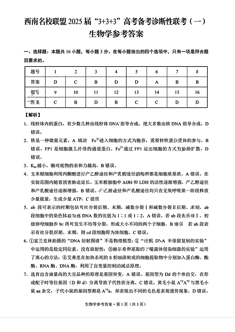 西南名校联盟 2025届 “3+3+3”高考备考诊断性联考(一)生物答案.pdf