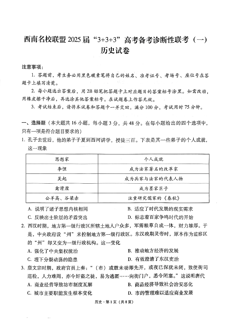 西南名校联盟 2025届 “3+3+3”高考备考诊断性联考(一)历史.pdf