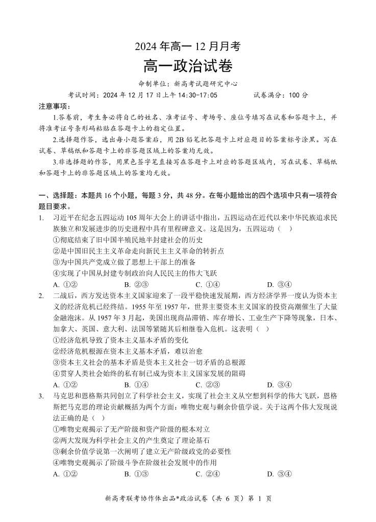 湖北省新高考联考协作体2024年高一12月月考 政治.pdf