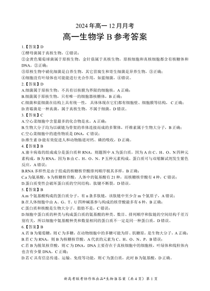 湖北省新高考联考协作体2024年高一12月月考 生物B答案.pdf
