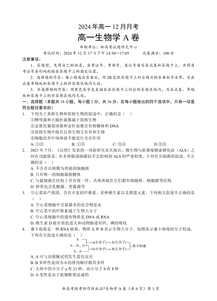 湖北省新高考联考协作体2024年高一12月月考 生物A.pdf