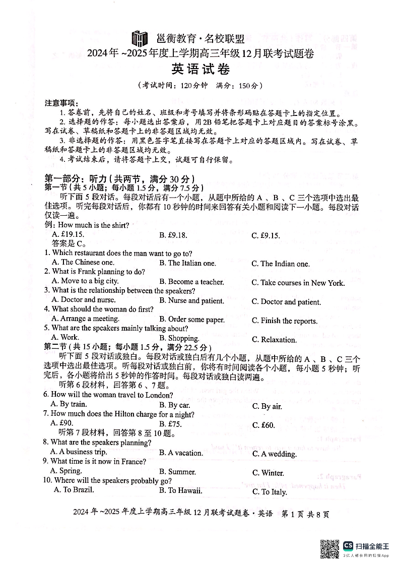 邕衡金卷·名校联盟2025届高三12月联考 英语.pdf
