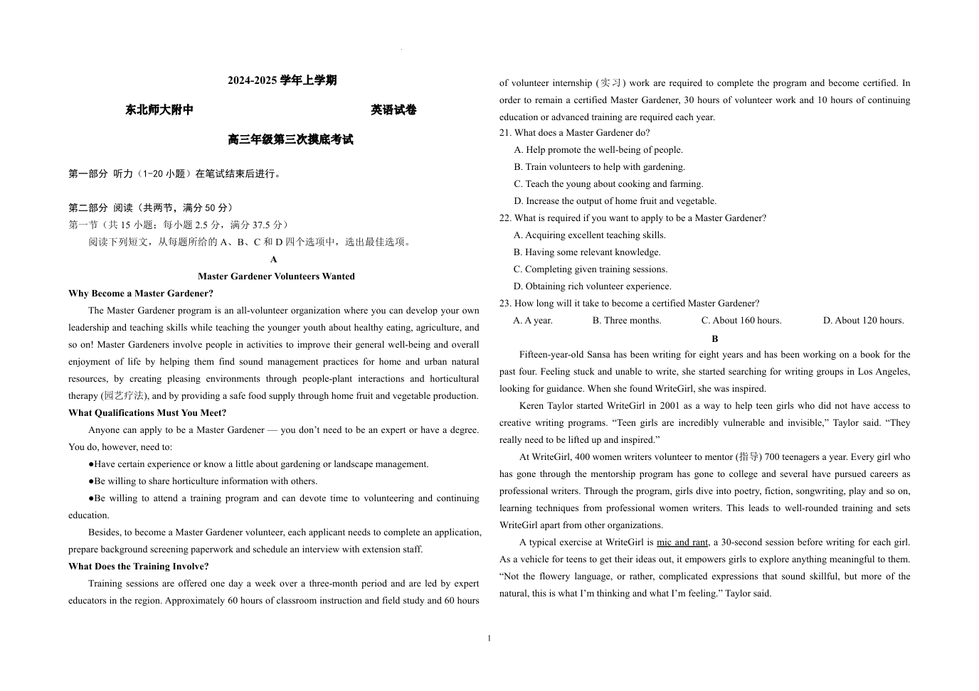 东北师范大学附属中学2024-2025学年高三上学期第三次摸底考试 英语.pdf
