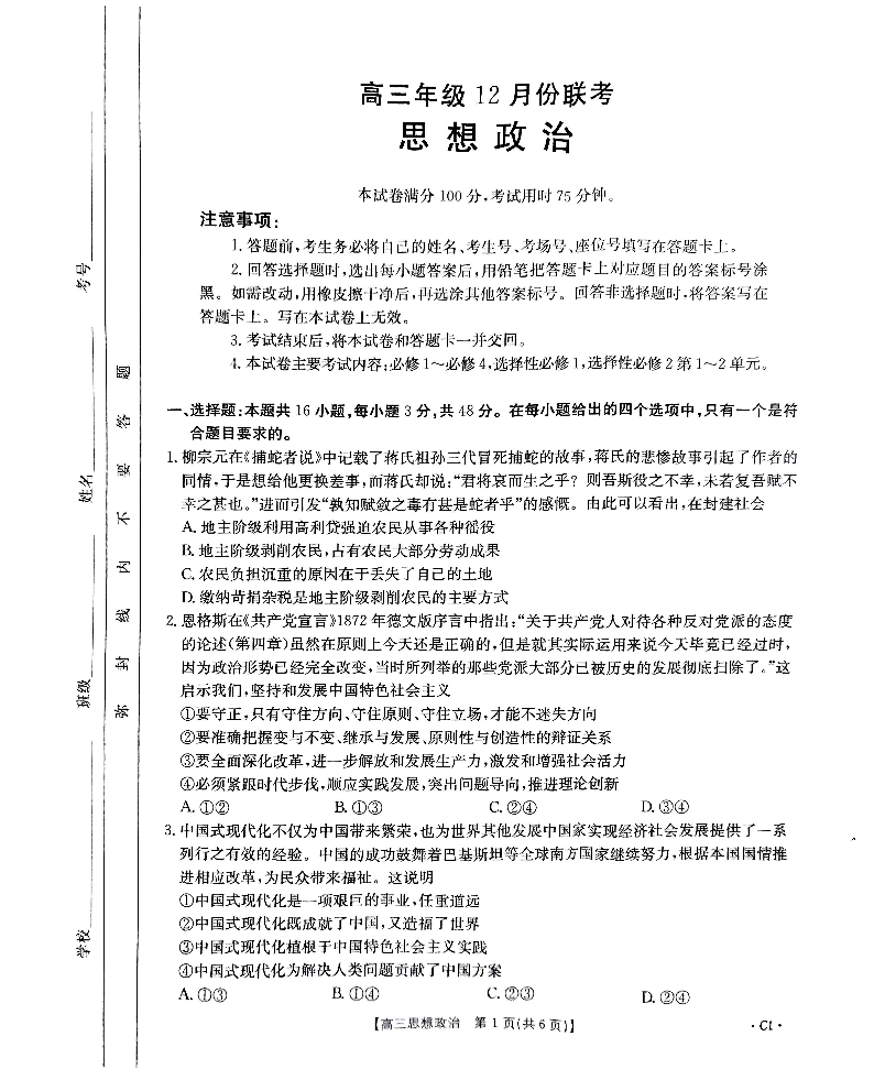 河北省保定市十县一中2024-2025学年高三上学期12月联考 政治.pdf