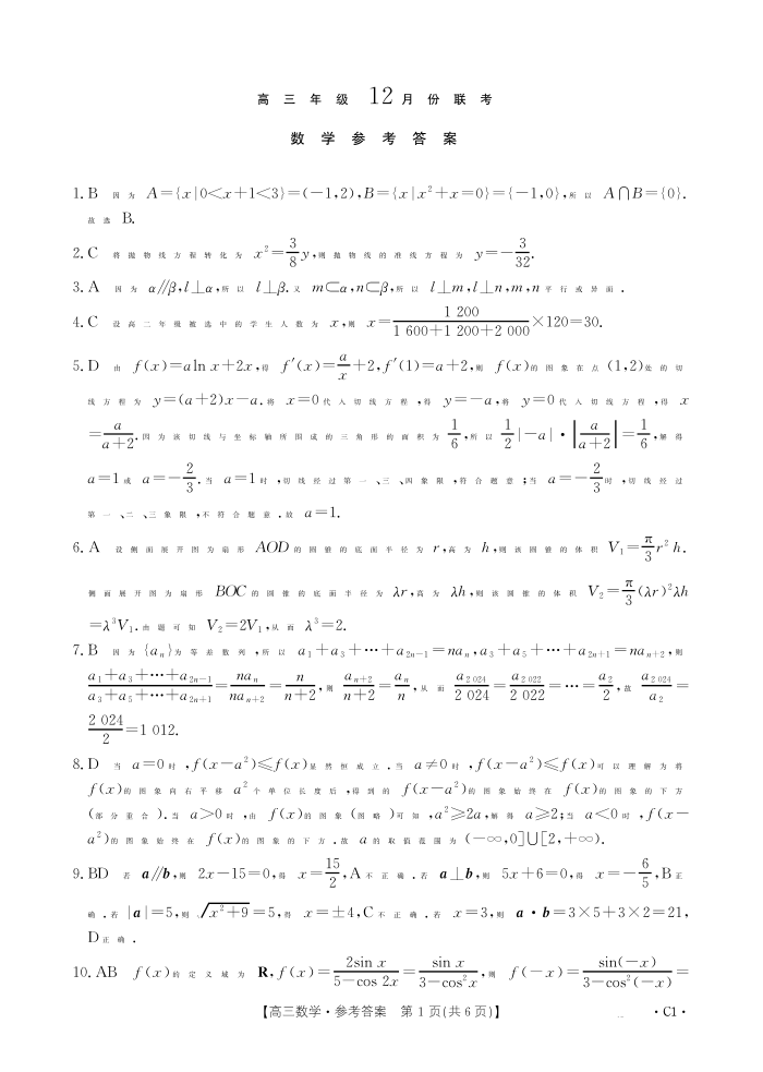 河北省保定市十县一中2024-2025学年高三上学期12月联考 数学答案.pdf