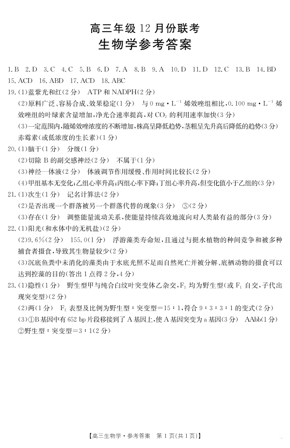 河北省保定市十县一中2024-2025学年高三上学期12月联考 生物答案.pdf
