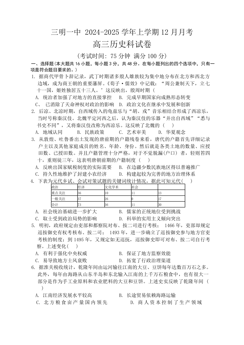 福建省三明市第一中学2025届高三上学期12月月考 历史.docx
