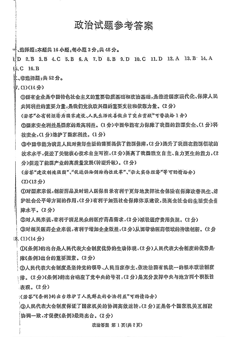 四川省九市2024-2025学年高三上学期(12月)第一次诊断性考试 政治答案.pdf