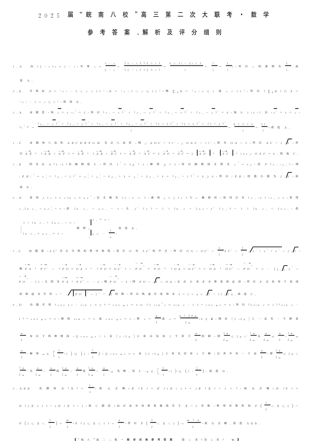 安徽省皖南八校2025届高三第二次大联考 数学答案.pdf