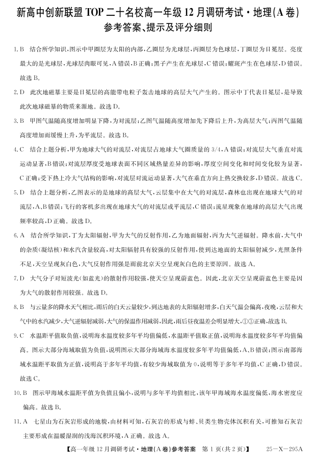 27 届高一年级 TOP二十名校12月调研考试地理(A卷人教版)答案.pdf