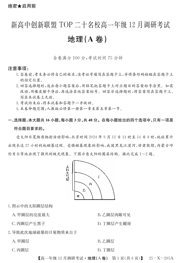 27 届高一年级 TOP二十名校12月调研考试地理(A卷人教版)试卷.pdf