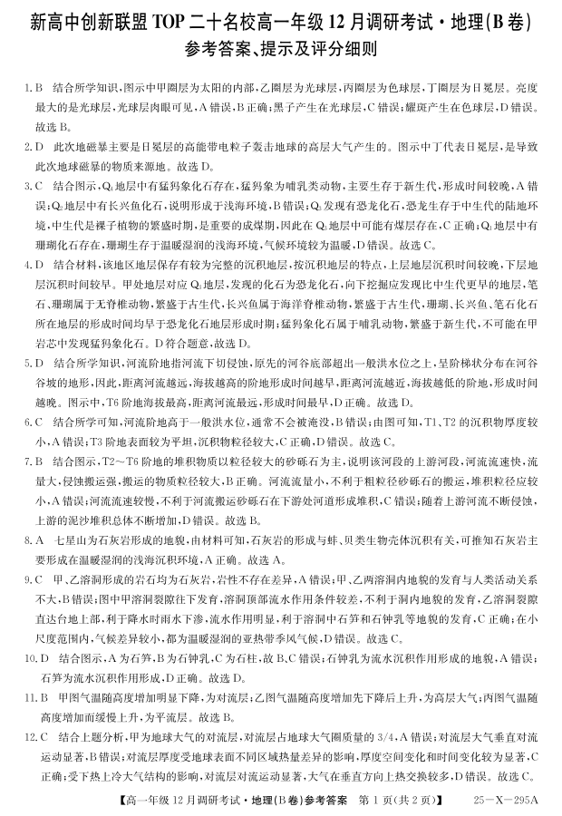 27 届高一年级 TOP二十名校12月调研考试地理(B卷湘教版)答案.pdf