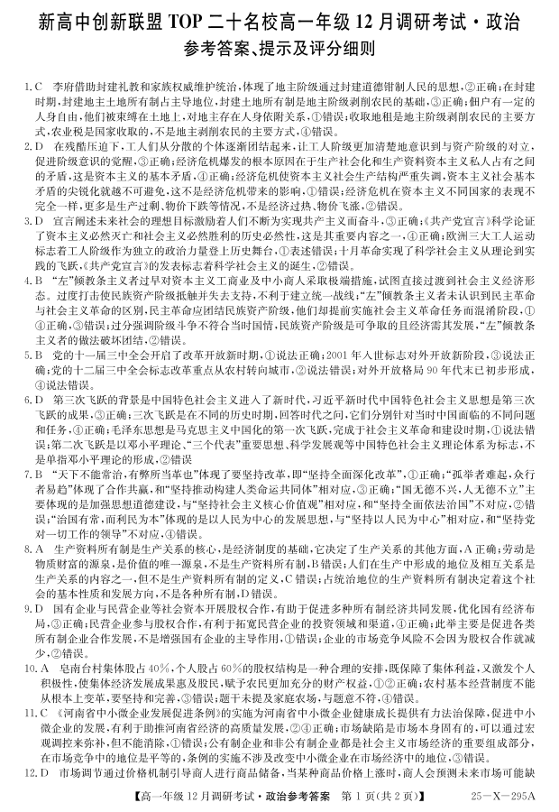 27 届高一年级 TOP二十名校12月调研考试政治答案.pdf