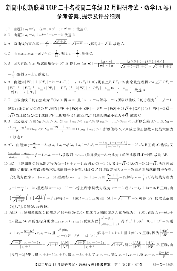 26 届高二年级 TOP二十名校12月调研考试数学(人教A)答案 .pdf