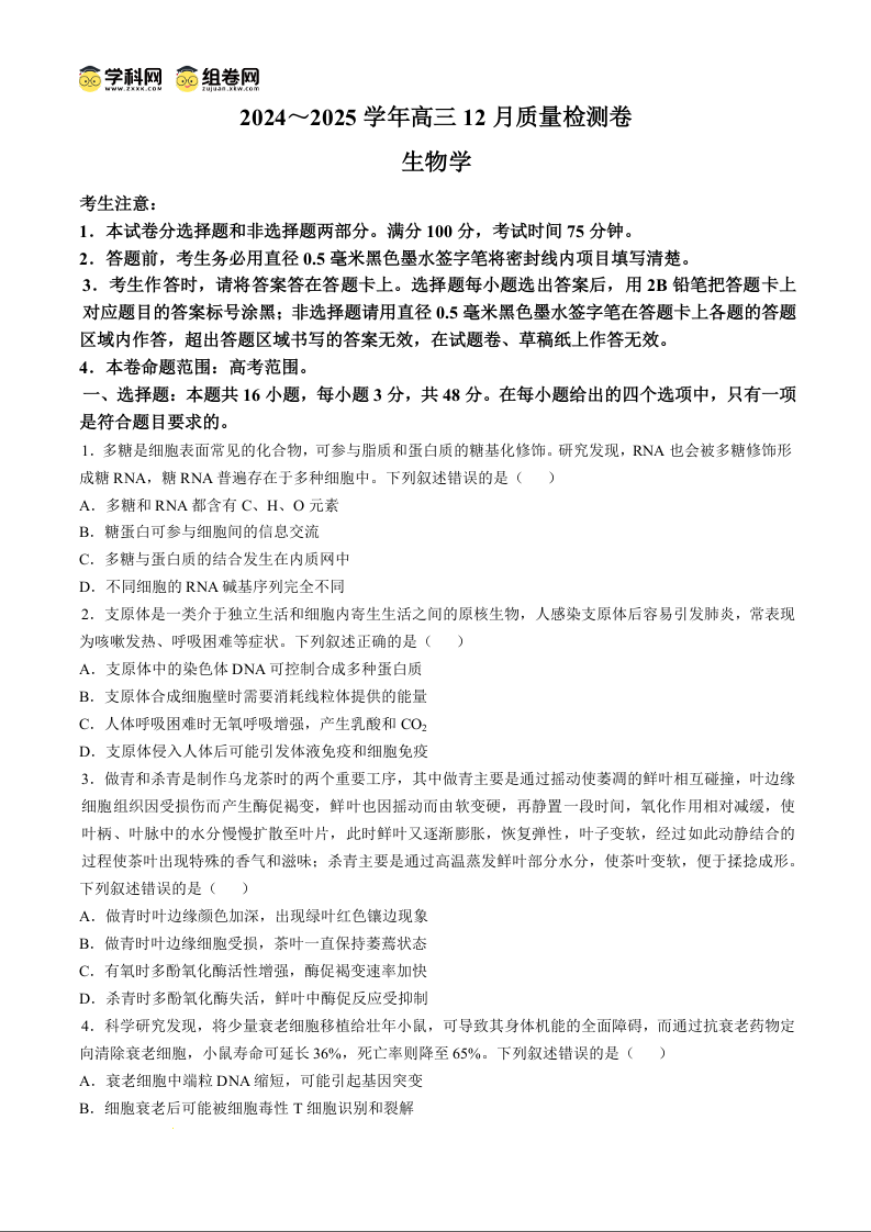 山西省卓越联盟2025届高三12月质量检测 生物.docx