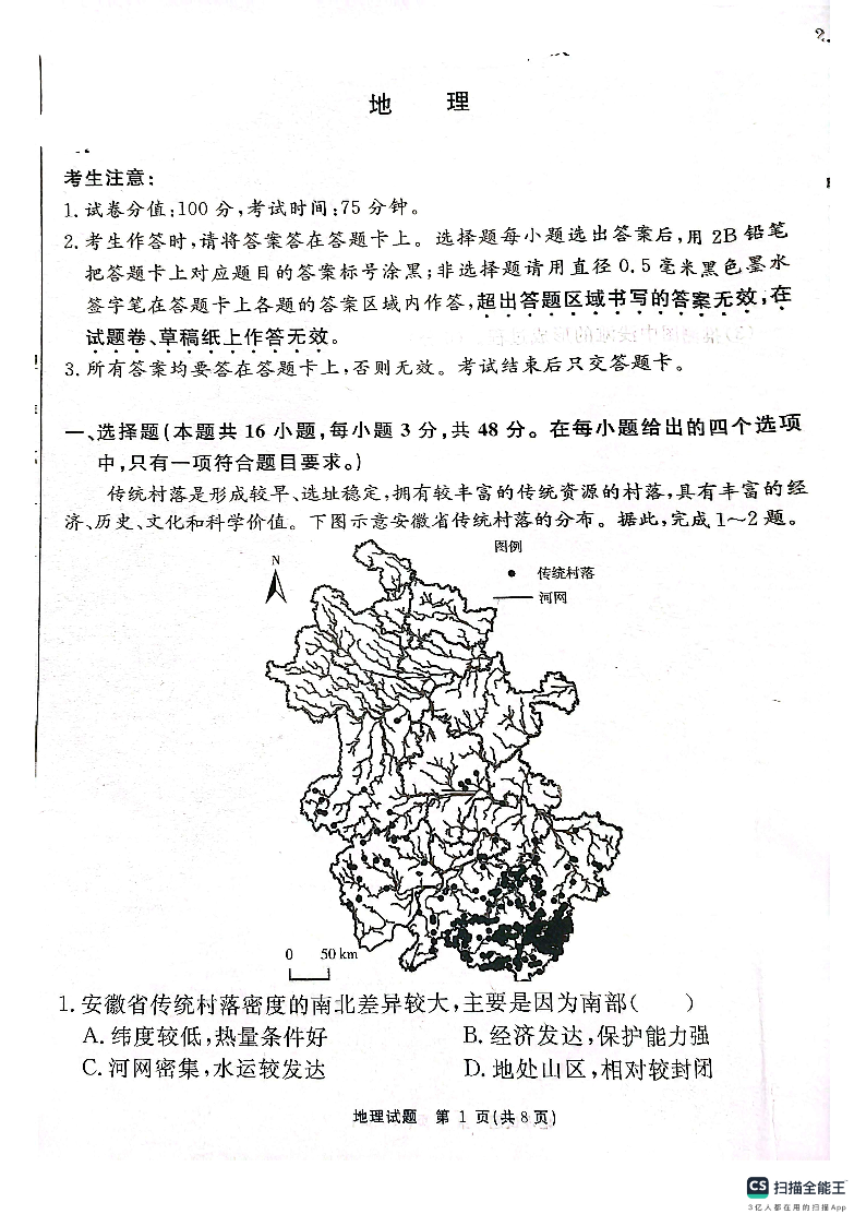 安徽师范大学附属中学2025届高三12月模拟考试 地理.pdf