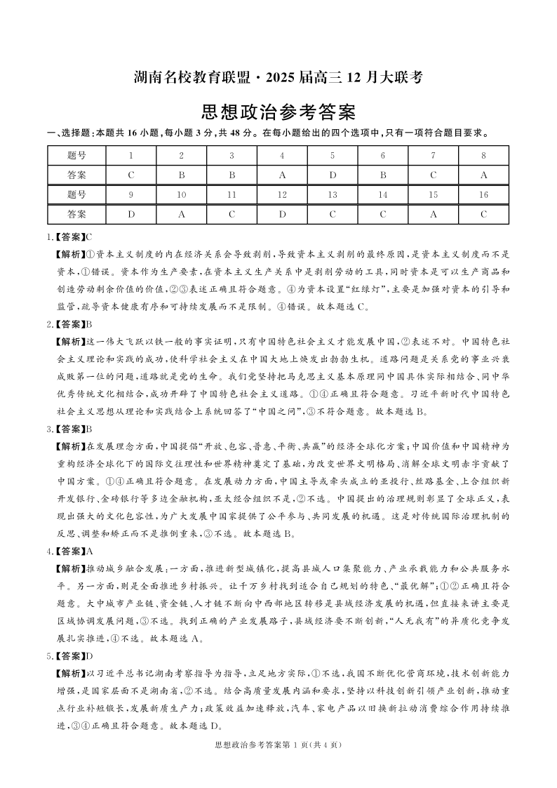 湖南省名校教育联盟2025届高三上学期12月大联考 政治答案.pdf