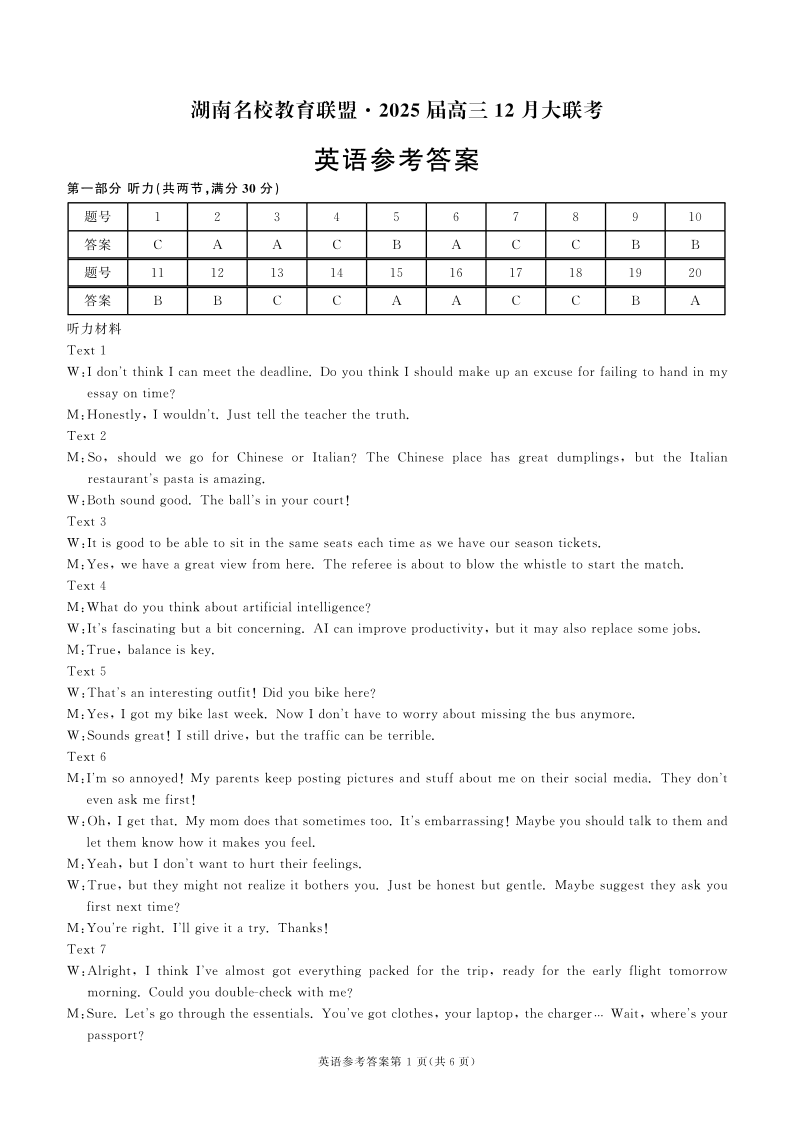 湖南省名校教育联盟2025届高三上学期12月大联考 英语答案.pdf