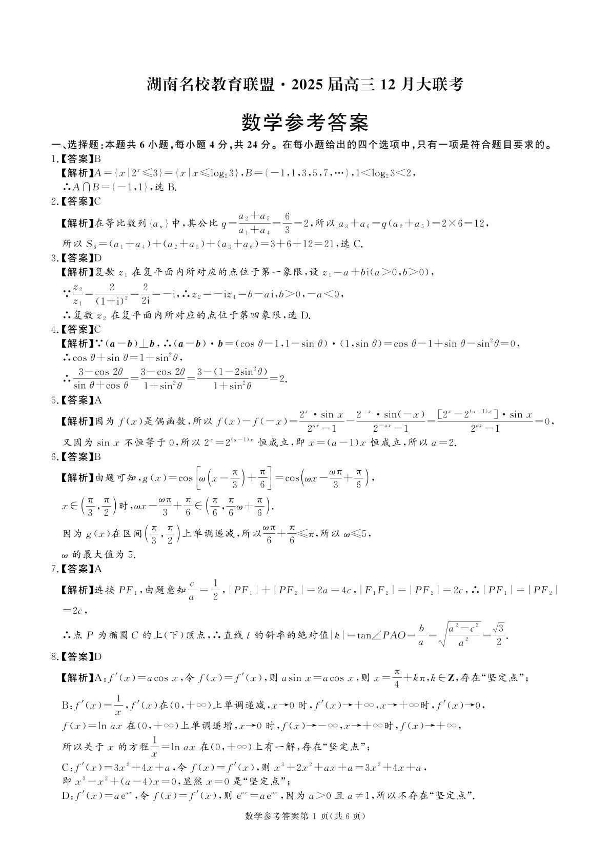 湖南省名校教育联盟2025届高三上学期12月大联考 数学答案.pdf