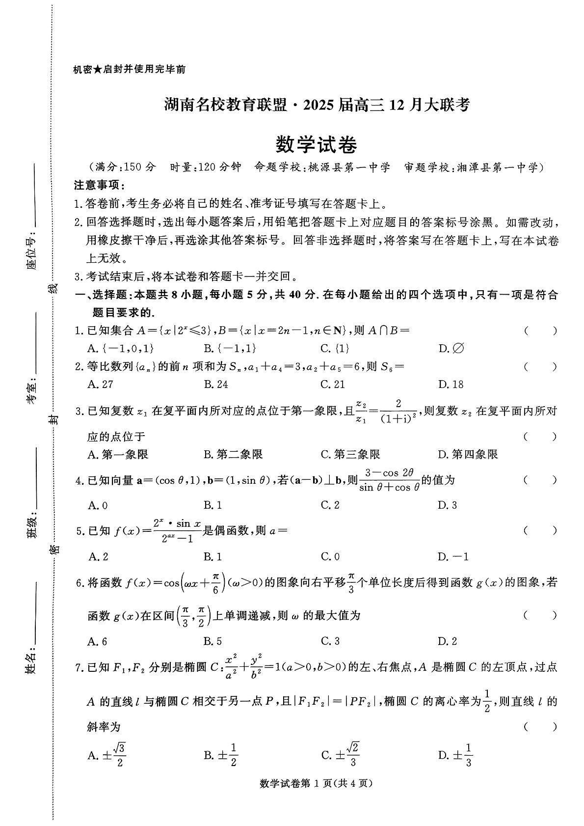 湖南省名校教育联盟2025届高三上学期12月大联考 数学.pdf