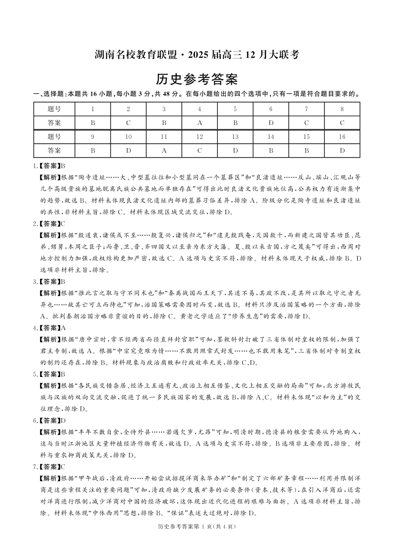 湖南省名校教育联盟2025届高三上学期12月大联考 历史答案.pdf