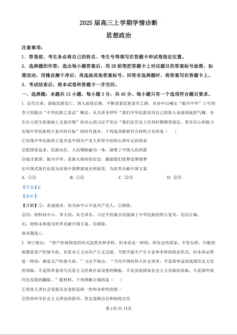 山东省百校大联考2025届高三上学期12月学情诊断 政治答案.docx