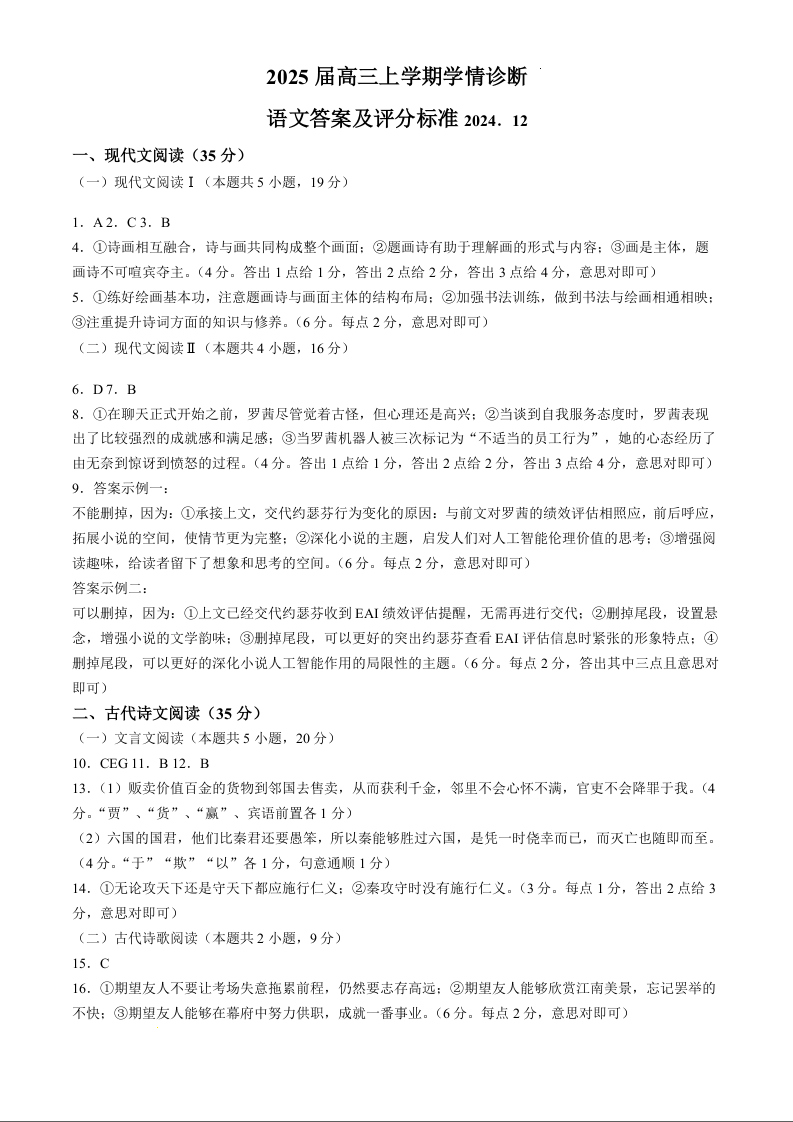 山东省百校大联考2025届高三上学期12月学情诊断 语文答案.docx