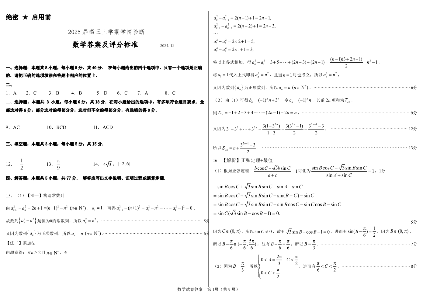 山东省百校大联考2025届高三上学期12月学情诊断 数学答案.pdf