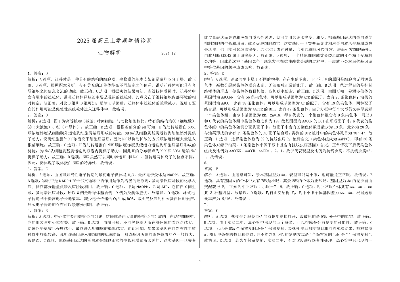 山东省百校大联考2025届高三上学期12月学情诊断 生物答案.pdf