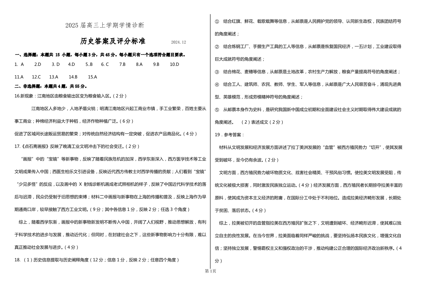 山东省百校大联考2025届高三上学期12月学情诊断 历史答案.pdf