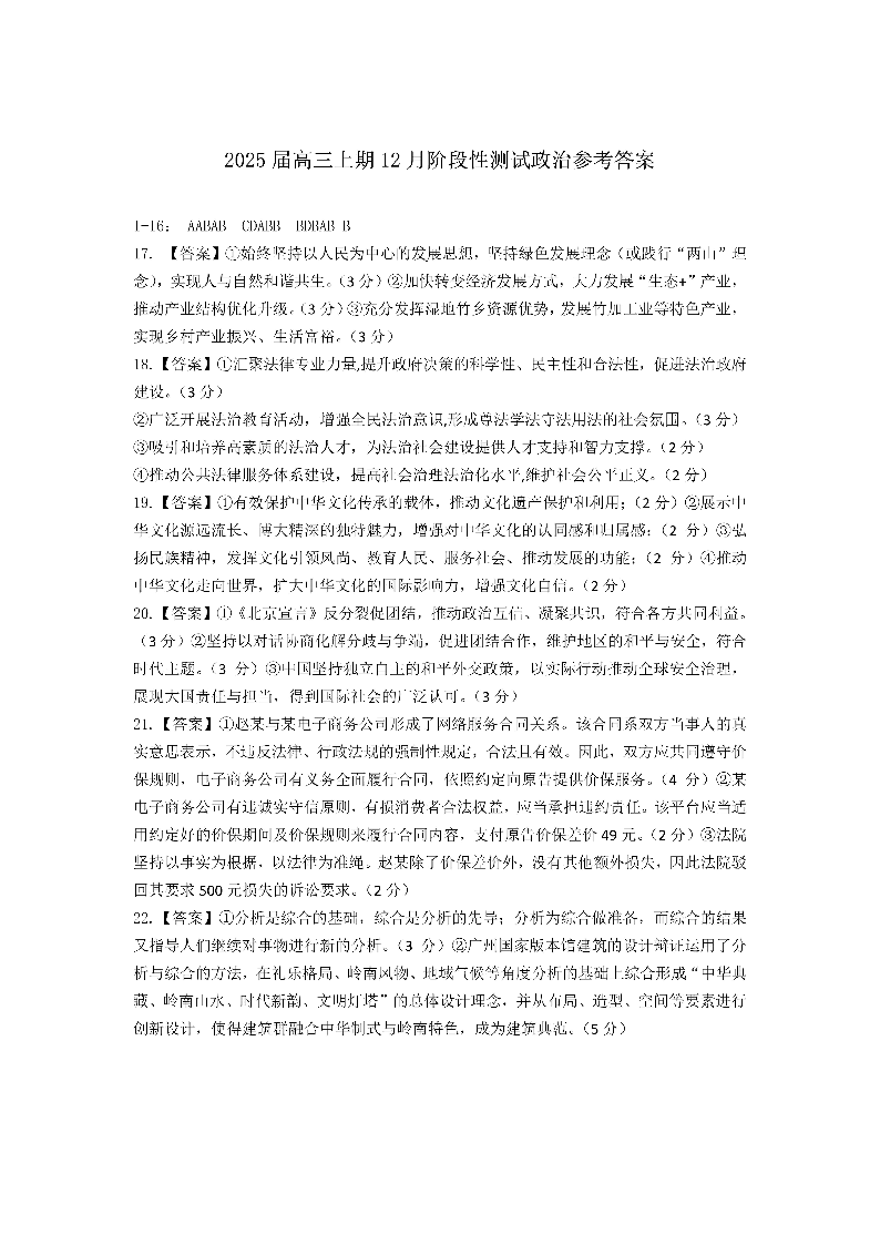 四川省成都市第七中学2025届高三上学期12月阶段性考试 政治答案.pdf