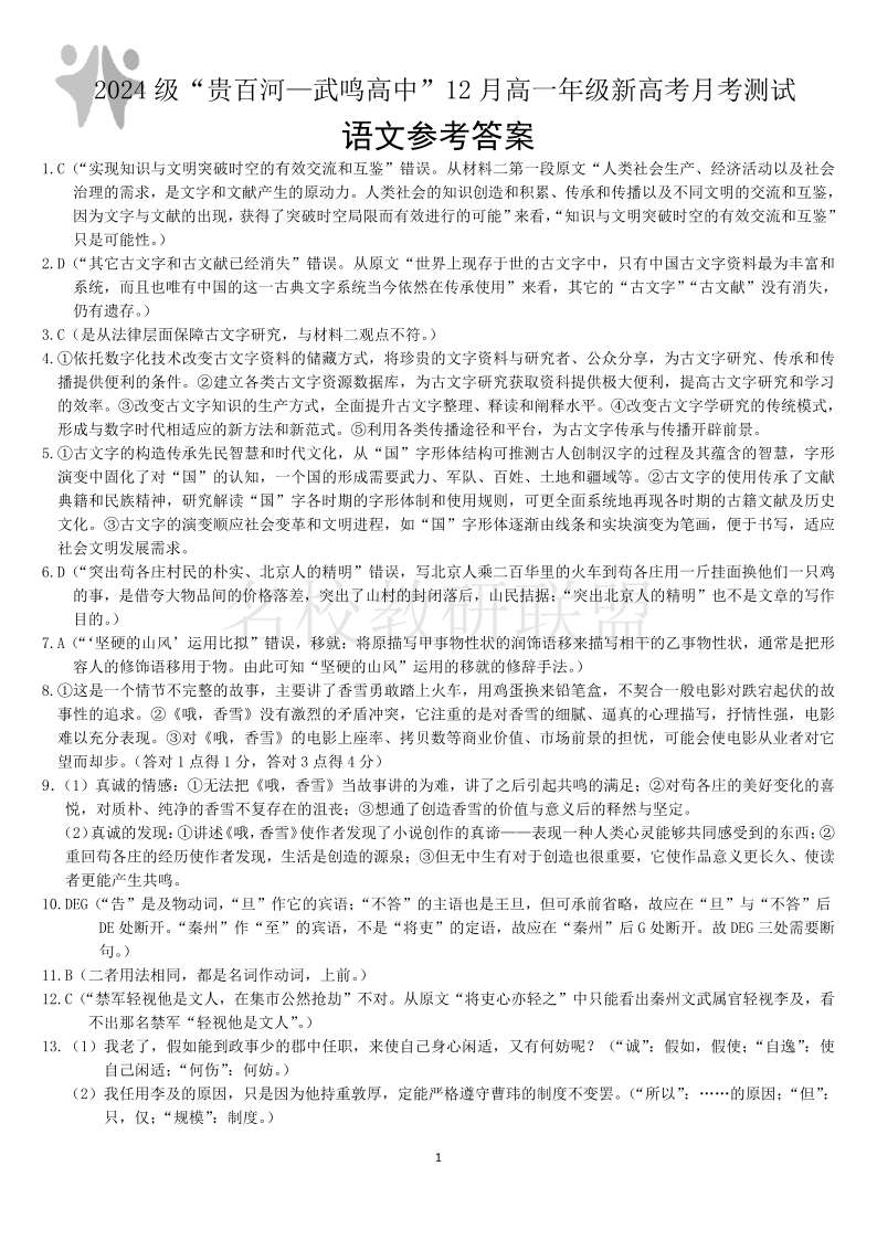 2024 级“贵百河—武鸣高中”12 月高一年级新高考月考测试 语文答案.pdf