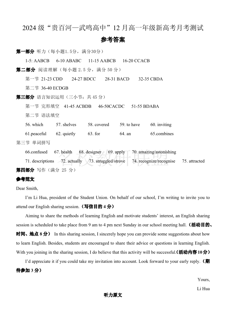 2024 级“贵百河—武鸣高中”12 月高一年级新高考月考测试 英语答案.pdf