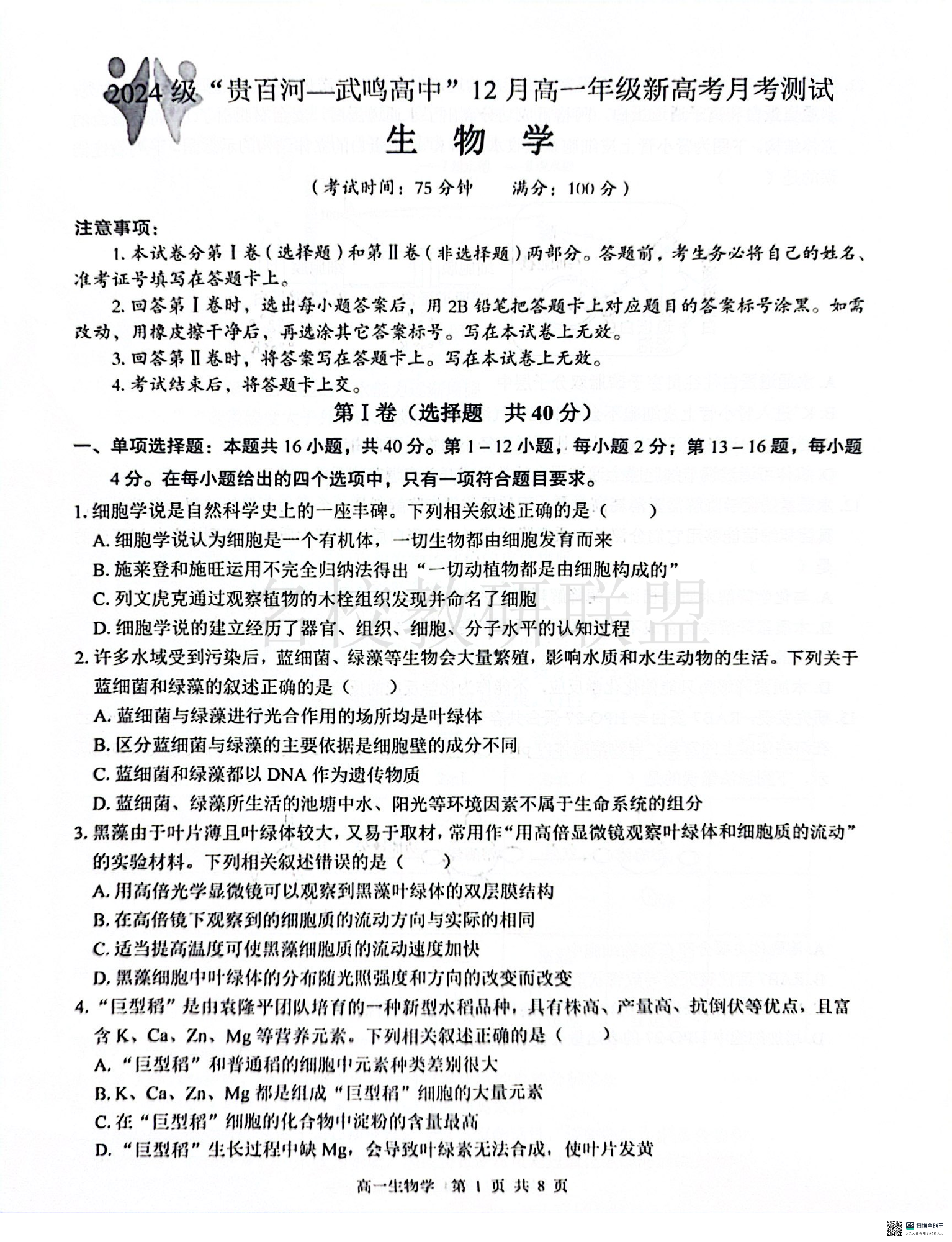 2024 级“贵百河—武鸣高中”12 月高一年级新高考月考测试 生物.pdf