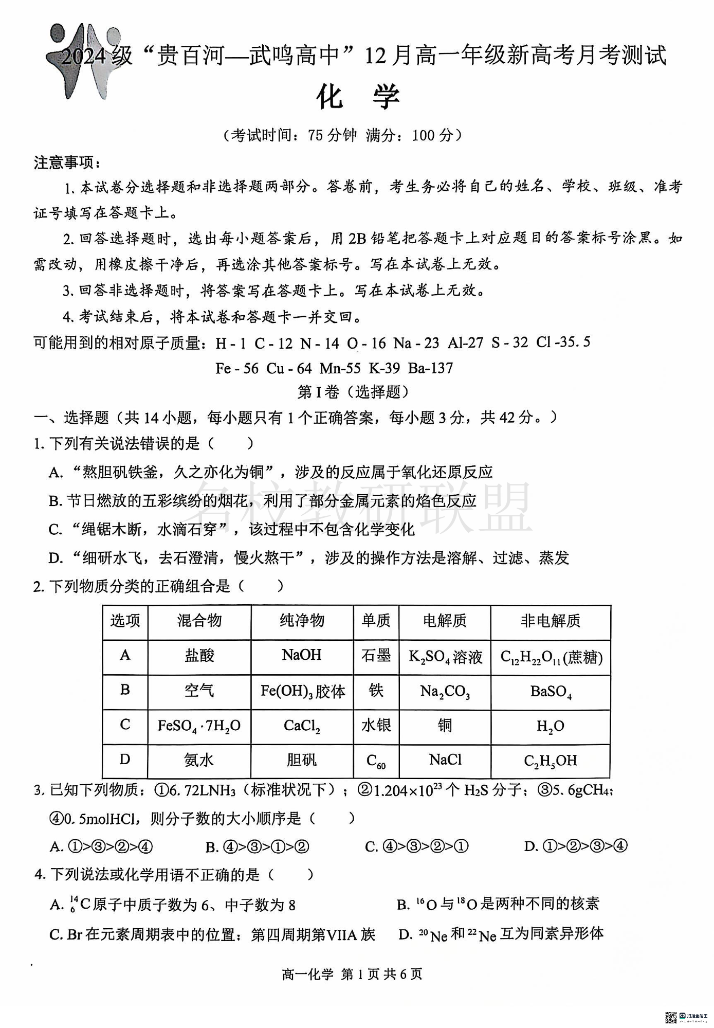 2024 级“贵百河—武鸣高中”12 月高一年级新高考月考测试 化学.pdf