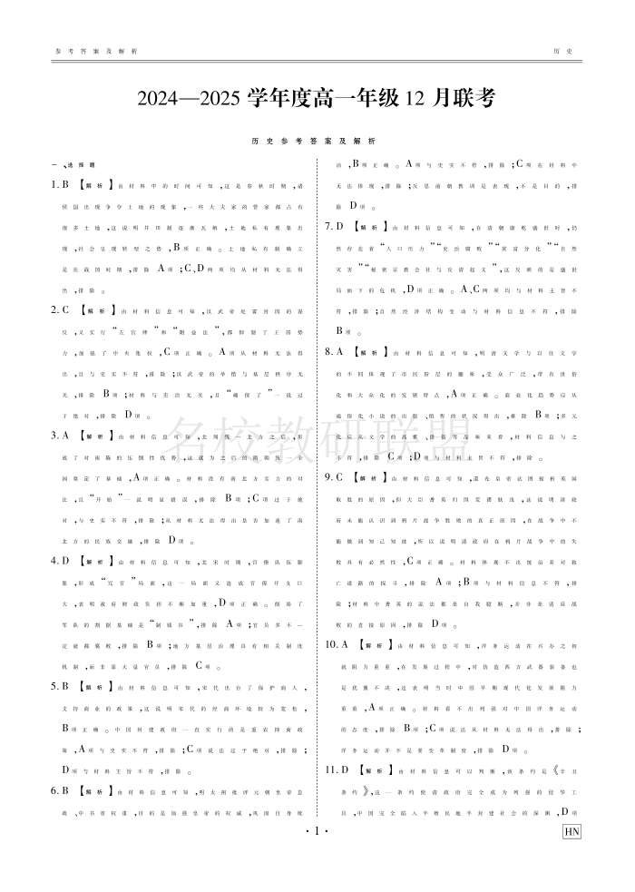 衡水金卷·2024-2025学年度高一年级12月联考 历史答案.pdf