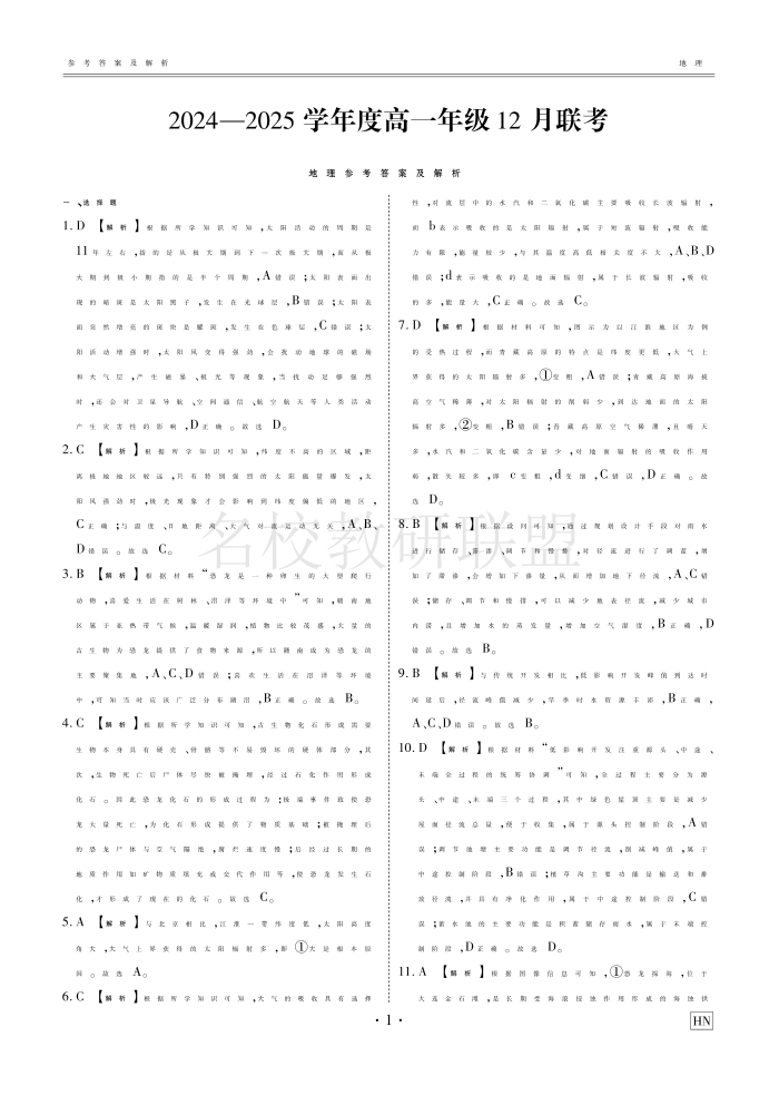 衡水金卷·2024-2025学年度高一年级12月联考 地理答案.pdf