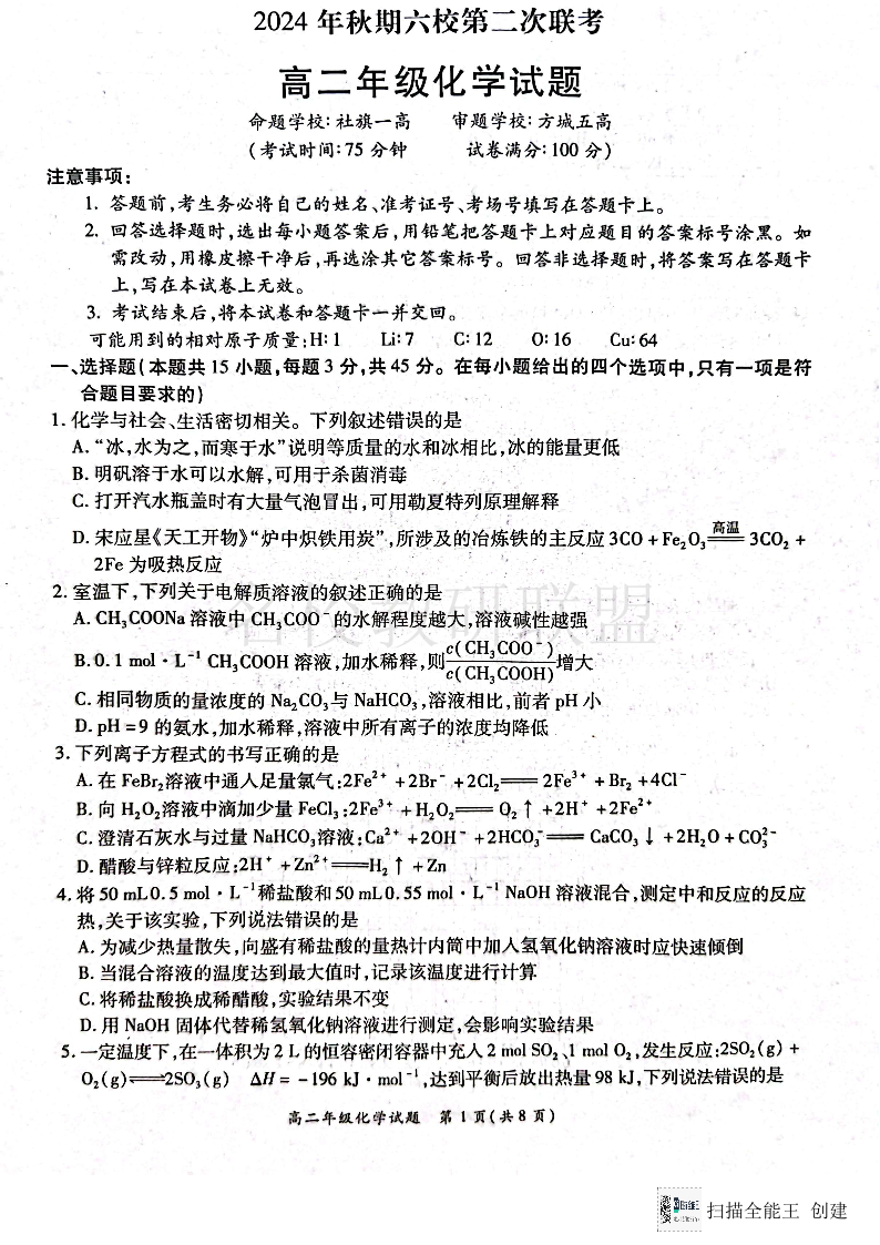 河南省南阳市六校2024-2025学年高二上学期12月联考 化学.pdf