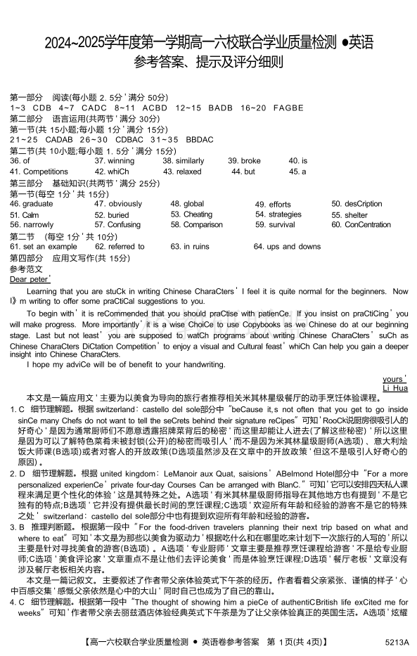 广东省2024~2025 学年度第一学期高一六校12月联合学业质量检测 英语答案.pdf