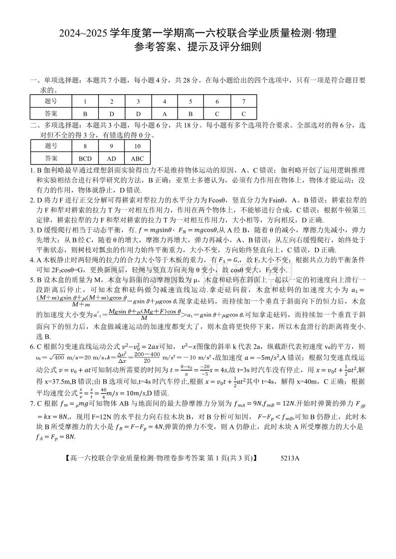 广东省2024~2025 学年度第一学期高一六校12月联合学业质量检测 物理答案.pdf