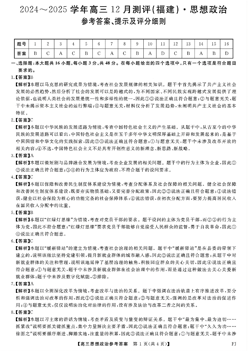 福建省金科大联考2024-2025学年高三12月测评 政治答案.pdf
