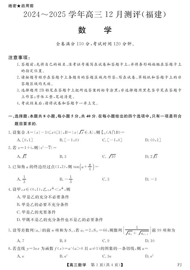 福建省金科大联考2024-2025学年高三12月测评 数学.pdf