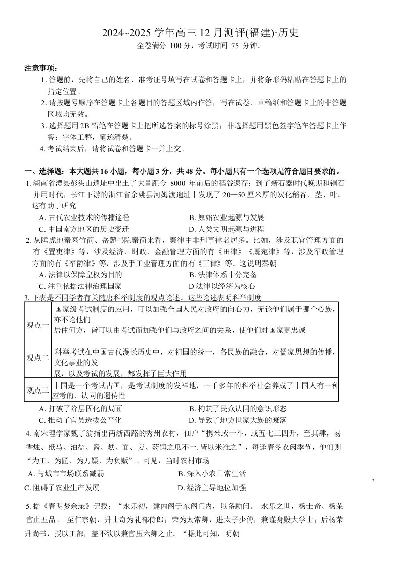 福建省金科大联考2024-2025学年高三12月测评 历史.docx