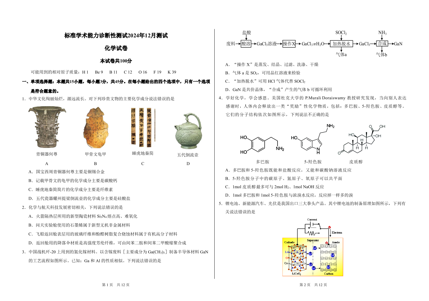 中学生标准学术能力诊断性测试2024-2025学年高三上学期12月月考试题 化学 PDF版含答案.pdf