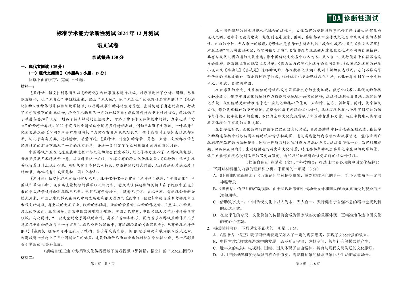 中学生标准学术能力诊断性测试2024-2025学年高三上学期12月月考试题 语文 PDF版含答案.pdf