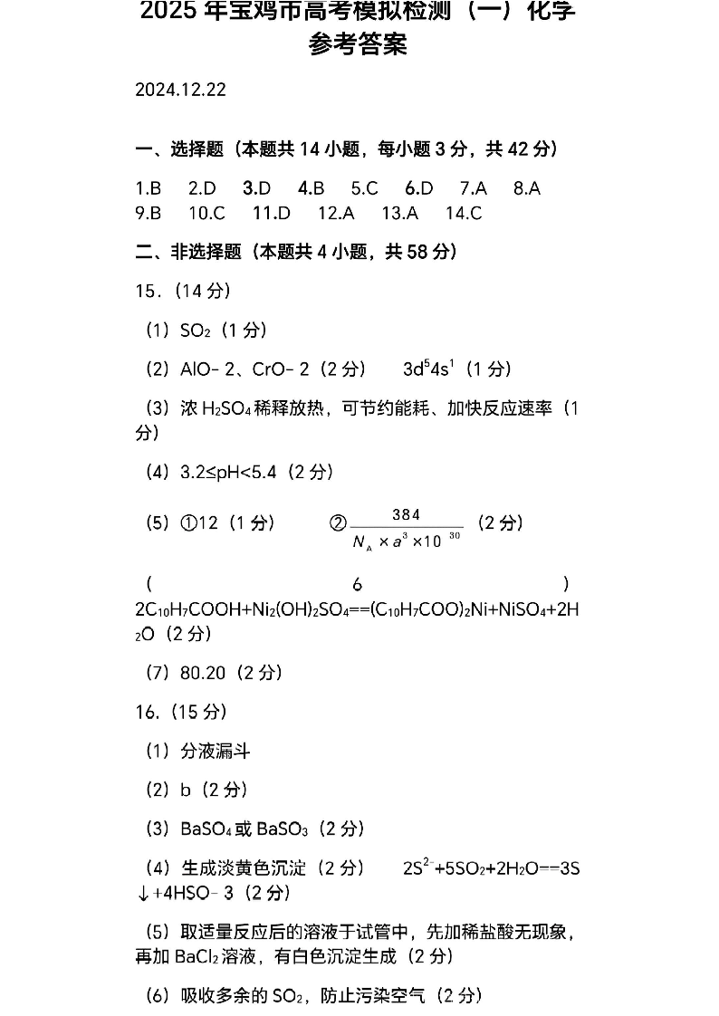 2025届陕西省宝鸡市高三上学期模拟检测(一)化学答案.pdf