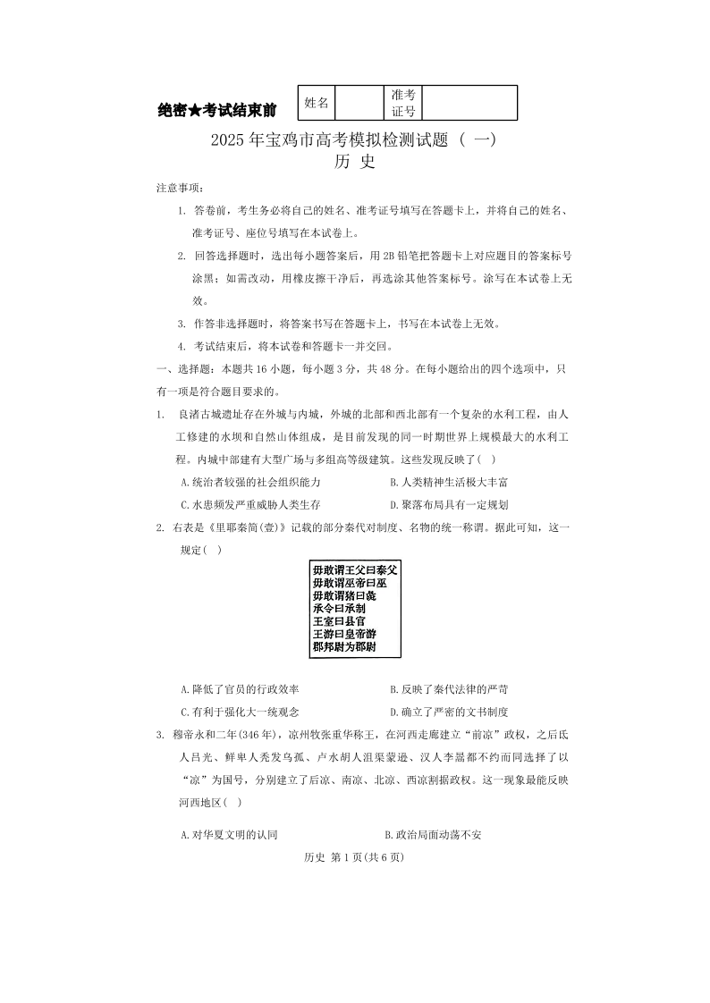 2025届陕西省宝鸡市高三上学期模拟检测(一)历史.pdf
