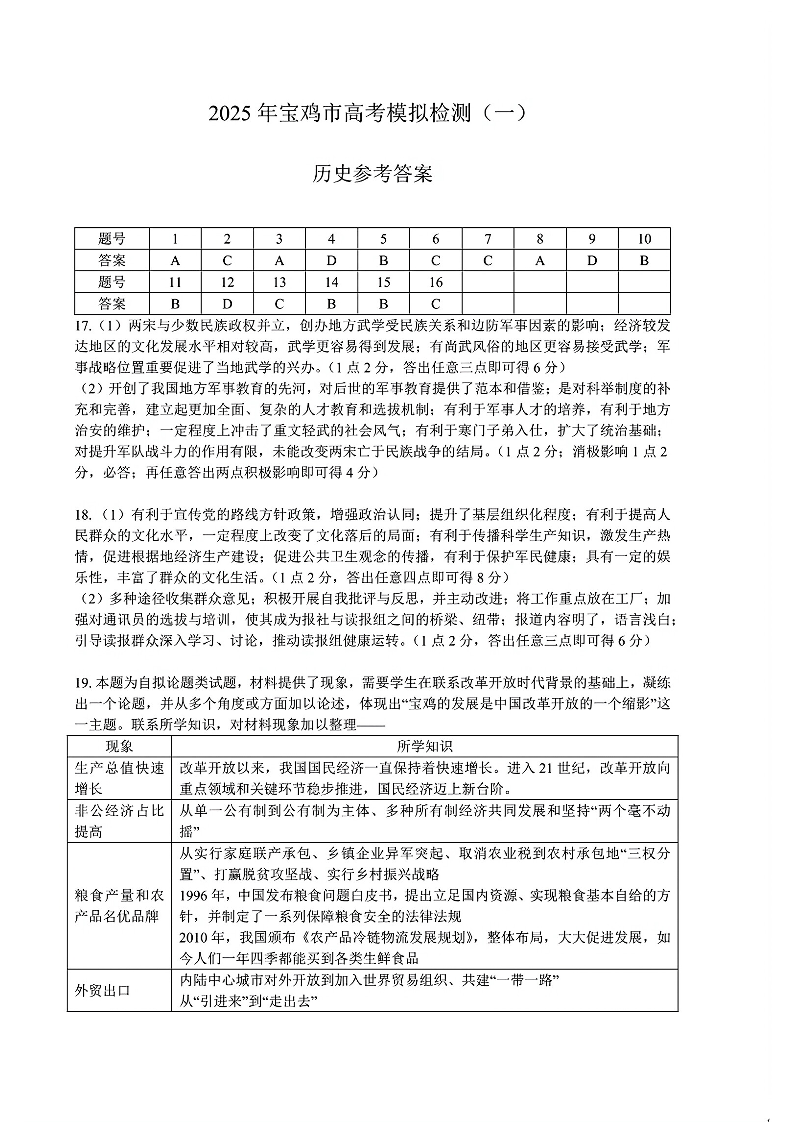 2025届陕西省宝鸡市高三上学期模拟检测(一)历史答案.pdf
