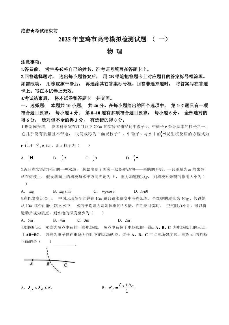 2025届陕西省宝鸡市高三上学期模拟检测(一)物理试题(含答案).docx
