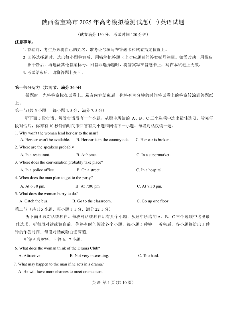 2025届陕西省宝鸡市高三上学期模拟检测(一)英语试题(含答案).docx